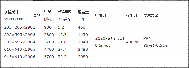濾料超細聚丙烯纖維,呈V型排列在一個非常緊密的聚苯烯或鋁合金的支撐外框內;