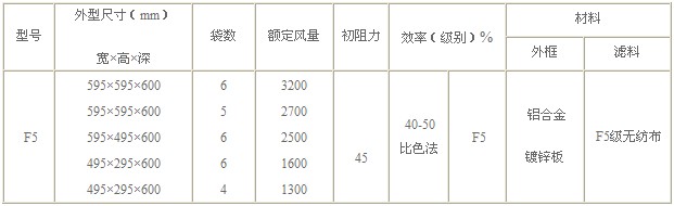 F5級(jí)袋式中效過濾器型號(hào)尺寸及其它參數(shù):