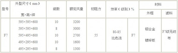 F7級袋式中效過濾器型號尺寸及其它參數: