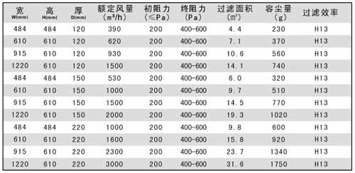 紙隔板高效過濾器規格尺寸及其它參數