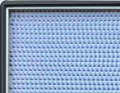 紙隔板高效過濾器使用隔板式設計,波紋型隔板可以精確地保持這層間距,有小阻力下,大限度地利用濾料,過濾器濾材兩面180褶翻折形成契型褶層,濾料折彎時有兩道壓痕,使其在隔板的末端開成契型盒式褶層,這樣可以防止濾料破損,在腐蝕的環境中,可以使用鍍乙烯鋁隔板,捕捉0.3UM粒子效率99.99%。