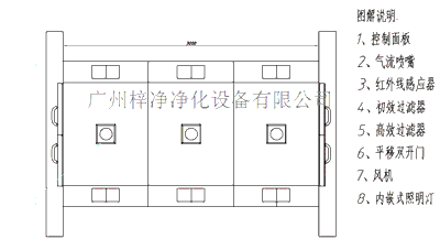,污染微粒就經高效過濾的高潔凈度潔凈空氣射掉,25m/s以上的高風速確保了有效的噴射和漂移微粒經過粗高兩級過濾器基本過濾掉。