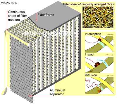 高效過濾器采用超細玻璃纖維紙作濾料,膠版紙、鋁膜等材料作分割板,與木框鋁合金膠合而成。